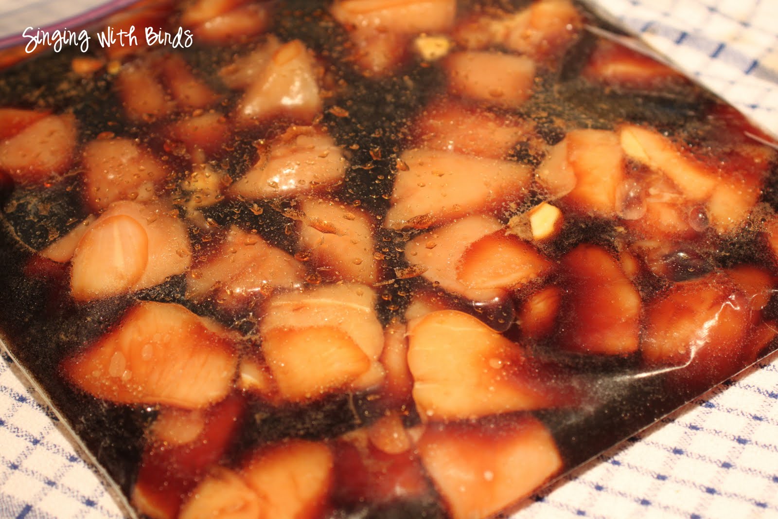 Put it in a zip-top bag and add 7 Up, soy sauce, and crushed garlic cloves.